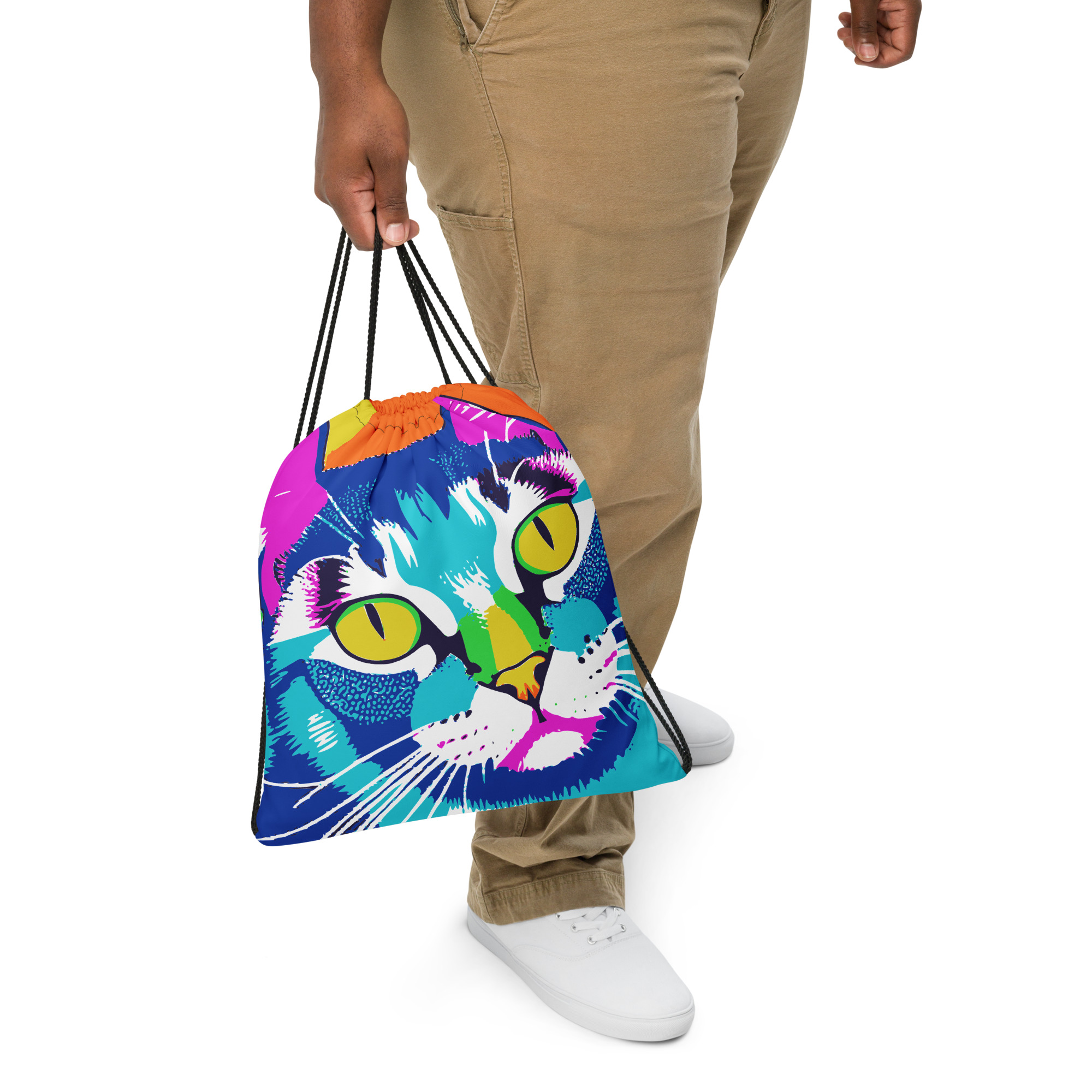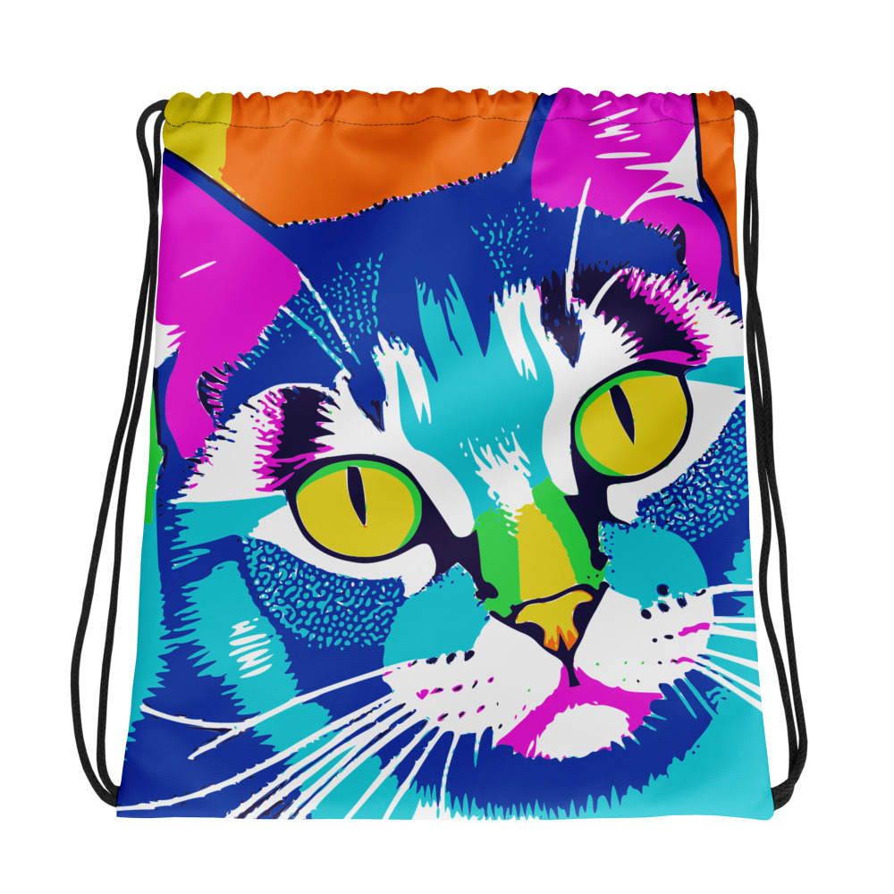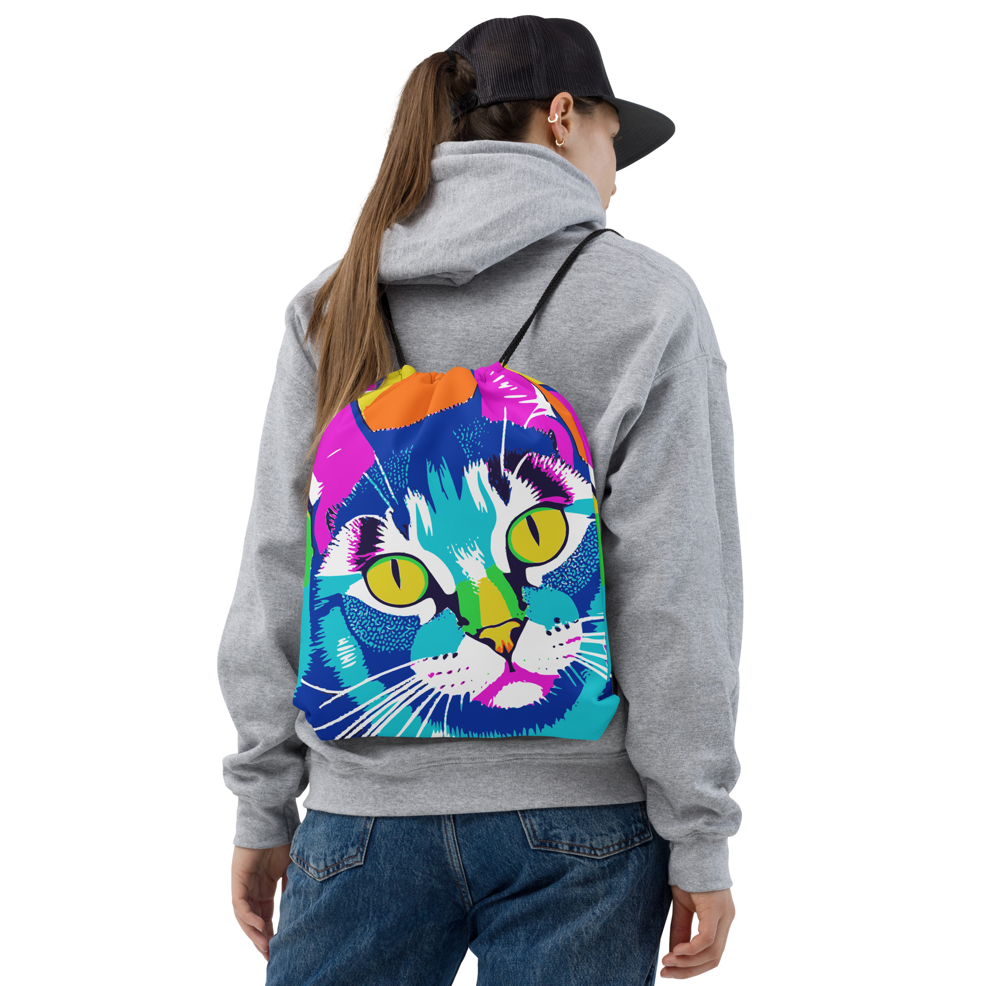 Kombiniere deine Liebe zu lebendigen Drucken und einem sportlichen Stil mit einer coolen Kordelzugtasche. Sie ist ein unverzichtbares Teil für das Fitnessstudio und kann als Rucksack getragen werden, mit Kordelzugverschluss oben und schmalen, kontrastierenden Schultergurten.